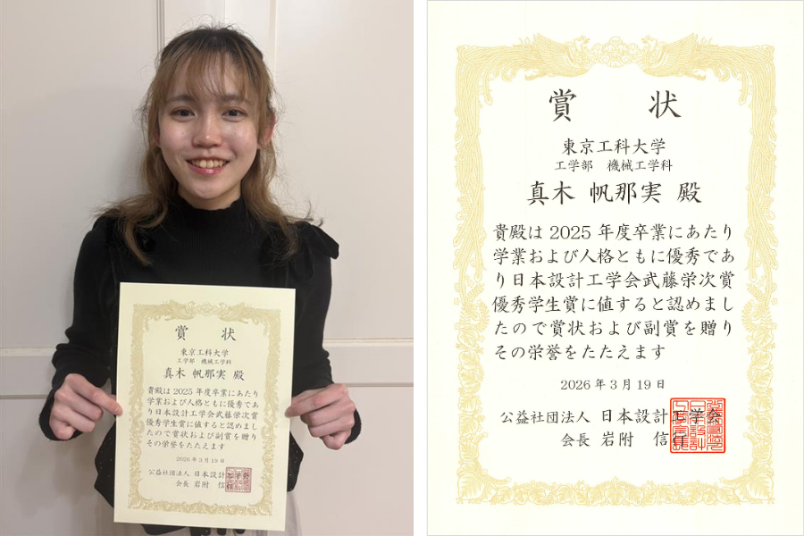 工学部機械工学科の真木帆那実さんが日本設計工学会の「武藤栄次賞優秀学生賞」を受賞