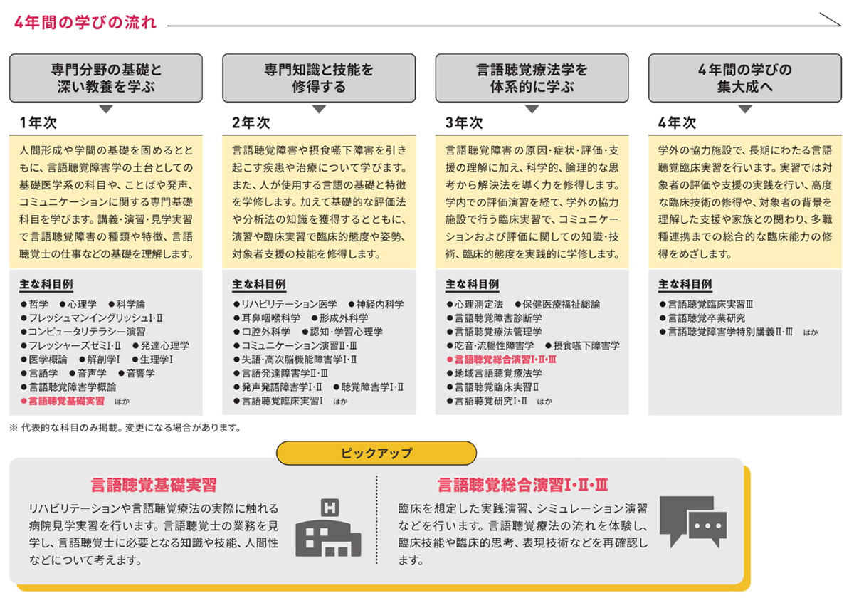 医療に関する幅広い必修科目を中心に学修します。また、リハビリテーション医学や言語学、音声学、聴覚心理学など、言語聴覚学を専門的に学ぶために欠かせない基礎を固めます。