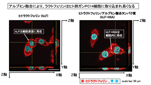 | Focusing on lactoferrin (LF), a protein that functions in innate immunity, we are currently engaged in the development of an LF-based biopharmaceutical, in collaboration with a biotech venture company. We have successfully developed a new formulation of Fc-fused human lactoferrin that does not exhibit any immune effector functions as potential side effects associated with its use. The fusion of human serum albumin (HSA) to hLF results in enhanced intracellular uptake, thereby demonstrating heightened anti-tumor and neuroprotective effects. |