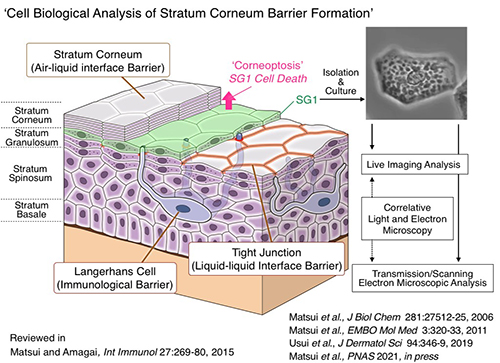| Around 360 million years ago, the first terrestrial vertebrates, amphibians, emerged from the water and adapted to life on land. They evolved their surface multilayered epithelia into keratinized stratified squamous epithelia (epidermis) to prevent water loss and protect the body from sunlight. With a particular emphasis on this epithelium, we aim to uncover the mystery of 'epithelial evolution.' The epidermis is composed of keratinized stratified squamous epithelia and consists of the stratum basale, stratum spinosum, stratum granulosum (SG), and stratum corneum (SC). Our group has been focusing on the cell death mechanism of the uppermost stratum granulosum cells (SG1) to clarify how the SC barrier is formed. We recently demonstrated that, through intravital imaging of mouse skin, SG1 cell death begins with an irreversible, sustained intracellular Ca2+ elevation, followed by rapid acidification. These findings provide an important framework for understanding the unique cell death pathway in keratinocytes, referred to as 'corneoptosis.' We are currently working on correlative light and electron microscopic (CLEM) analysis of corneoptosis in amphibians, reptiles, aves and mammals. Comparative evolutionary cell biology of corneoptosis could enable us to dissect the mechanism of the adaptive evolution of skin. |