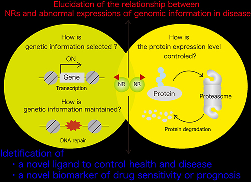 1. Elucidation of the relationship between NRs and abnormal expression of genomic information. 2. Identification of a novel NR ligand to control health and disease. 3. Identification of a novel biomarker to predict the drug sensitivity or prognosis. |
