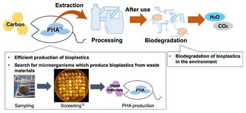 | Polyhydroxyalkanoates (PHAs), bioplastics synthesized by microorganisms, have excellent biodegradability and are expected as key materials to solve environmental problems caused by plastics. Novel and efficient production systems for PHAs with excellent properties, as well as their degradability, are investigated by utilizing molecular biological and genetic engineering methods. Isolation for novel PHA-producing bacteria is another target of the study to biologically synthesize PHA from waste materials. |