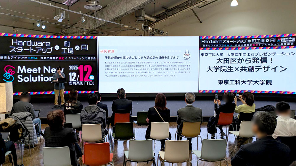 こうした連携の一環として、2025年12月12日(金)に丸の内で開催された展示・発表イベント「Meet New Solution in TiB(主催:大田区、大田区産業振興協会)」において、大学院デザイン研究科1年 新居 怜弥さんと尾崎 悠耶さんが発表を行いました。