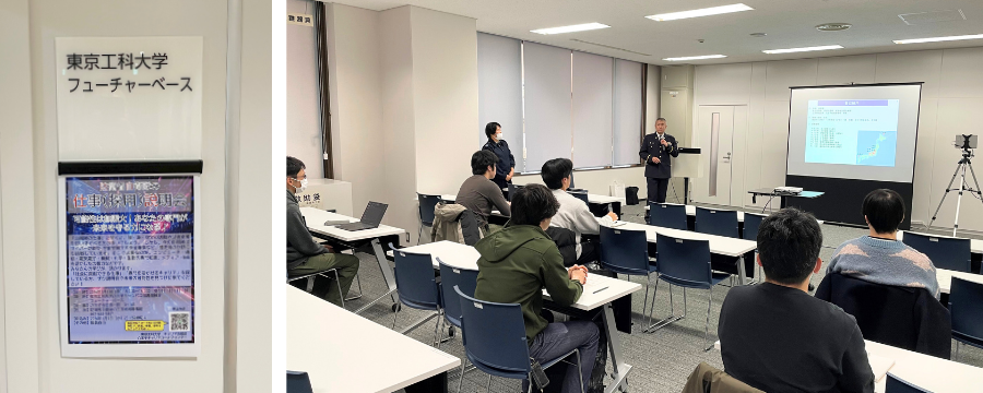 当日は、防衛省自衛隊八王子地域事務所のご担当者をお招きし、自衛隊の役割や業務内容、採用についてご説明いただきました。現在、自衛隊ではサイバー防衛や宇宙領域における安全確保といった分野を中心に、理系人材の積極的な採用を進めており、説明ではその背景や今後の展望についても紹介されました。特に、コンピュータ、通信、電気電子、機械、化学、生物といった専門知識に加え、メディアやWebを活用した広報力など、本学での学びが自衛隊のさまざまな業務に活かせる点について、具体的な事例を交えてご説明いただきました。