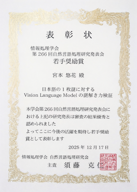 2025年12月15日(月)から17日(水)にかけて京都市にて開催された情報処理学会 第266回 自然言語処理研究発表会(IPSJ-NL266)において、メディア学部4年生の宮本 悠花さんが「若手奨励賞」を受賞しました。