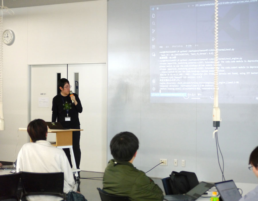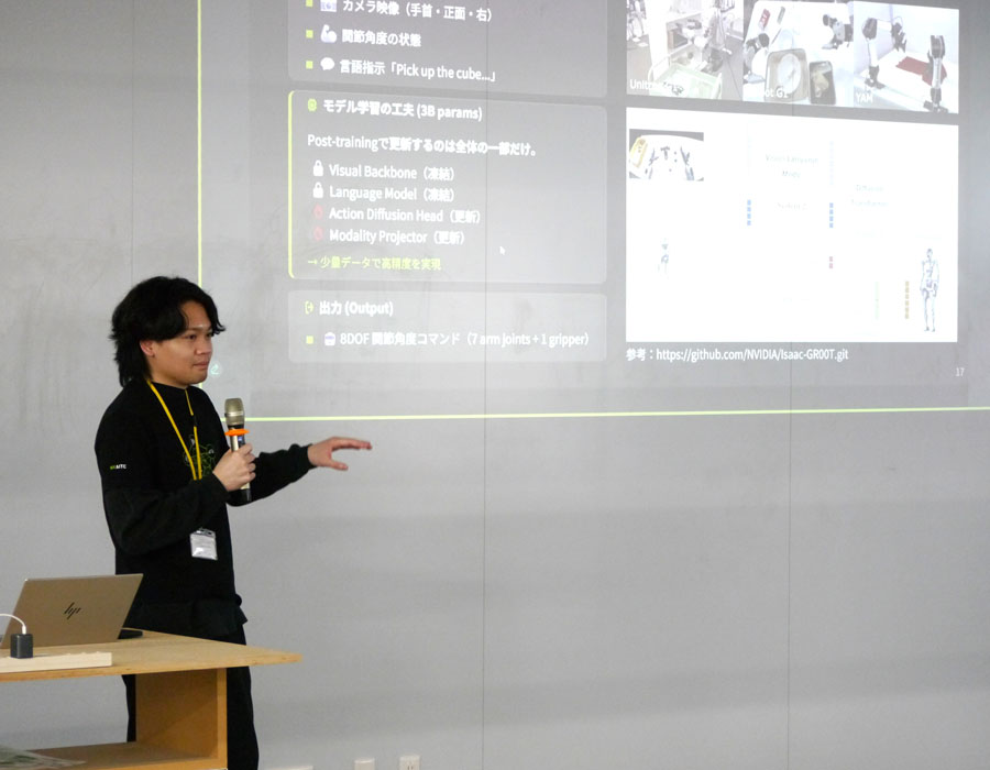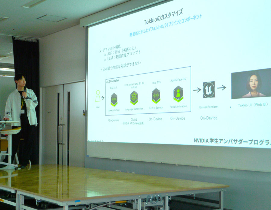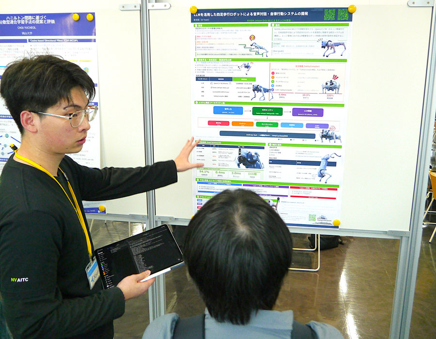 このワークショップは、「NVIDIA学生アンバサダープログラム※」に参加している学生が企画・運営を行い、NVIDIAの先端技術を活用した研究・開発などの成果を発表するものです。東京工科大学からは全国の大学で最多の10名が、AI・LLMセッション、デジタルツインセッション、ロボティクスセッション、ポスターセッションの各セッションで発表やハンズオン形式の学習体験を実施。また、合同ワークショップ全体の司会進行役も務めました。