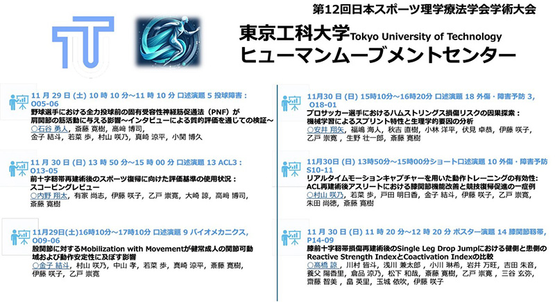 2025年11月29日(土)〜30日(日)に北海道で開催された「第12回日本スポーツ理学療法学会学術大会」において、ヒューマンムーブメントセンター研究員である石谷勇人、内野翔太、並びに本学理学療法学専攻4年生4名が参加し、研究成果を発表いたしました。