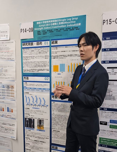 日本スポーツ理学療法学会学術大会は、スポーツ障害に対する理学療法に関する国内最大規模の学会であり、日本各地の理学療法士や研究者が集い、最新の知見を共有する場です。その中で、本学の研究員と学生が堂々と研究成果を発表し、スポーツ理学療法分野の第一線で活躍する専門家と積極的に議論を交わす貴重な機会となりました。本学およびヒューマンムーブメントセンターでは、今後も学生ならびに研究員の学術活動を積極的に支援し、科学的根拠に基づくスポーツ理学療法の発展に寄与してまいります。また、今回の経験を通じて得られた知見や学びを教育・臨床・研究へと還元し、より質の高い理学療法の実践を目指して取り組んでいきます。