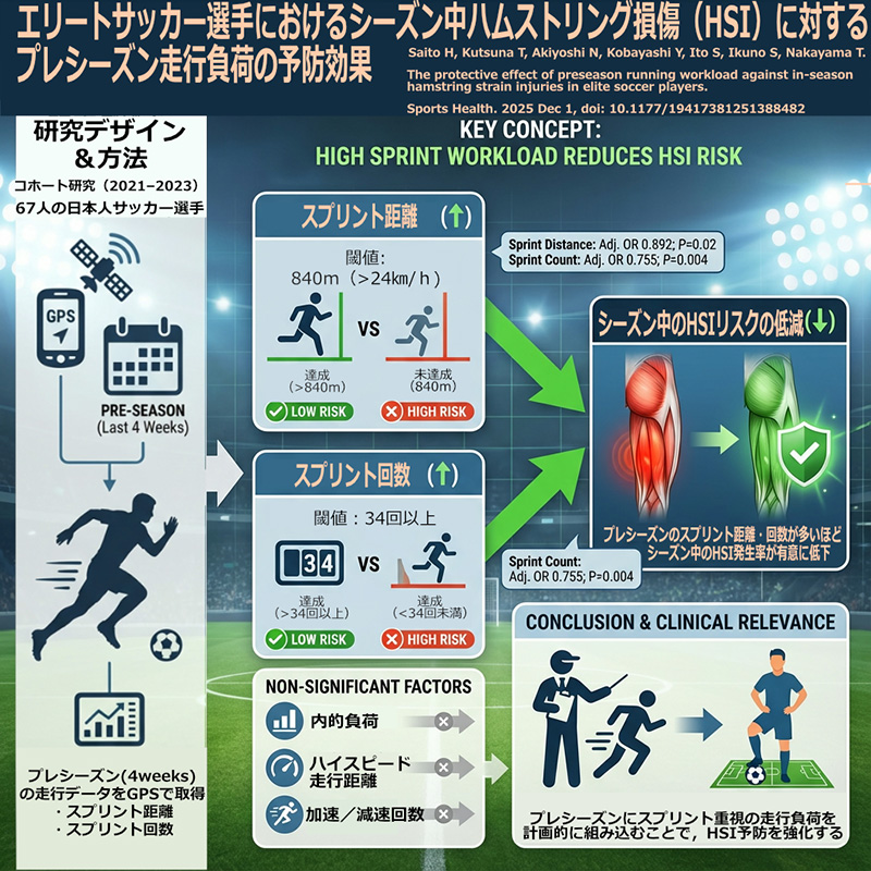 本成果は、プレシーズンにおけるスプリント刺激を「避けるべき負荷」ではなく、「計画的に積むべき準備負荷」として捉える視点を、科学的根拠とともに提示するものです。競技パフォーマンス向上と傷害予防の両立を目指す現場にとって、実践に直結する重要な示唆を与える研究成果といえます。