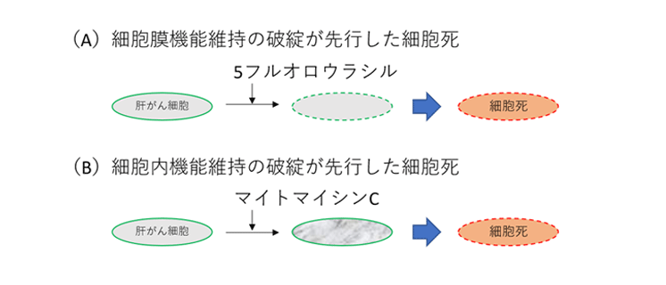 ・マイトマイシンC(MMC)と5-フルオロウラシル(5-FU)で、細胞死に至る過程が明確に異なることを発見